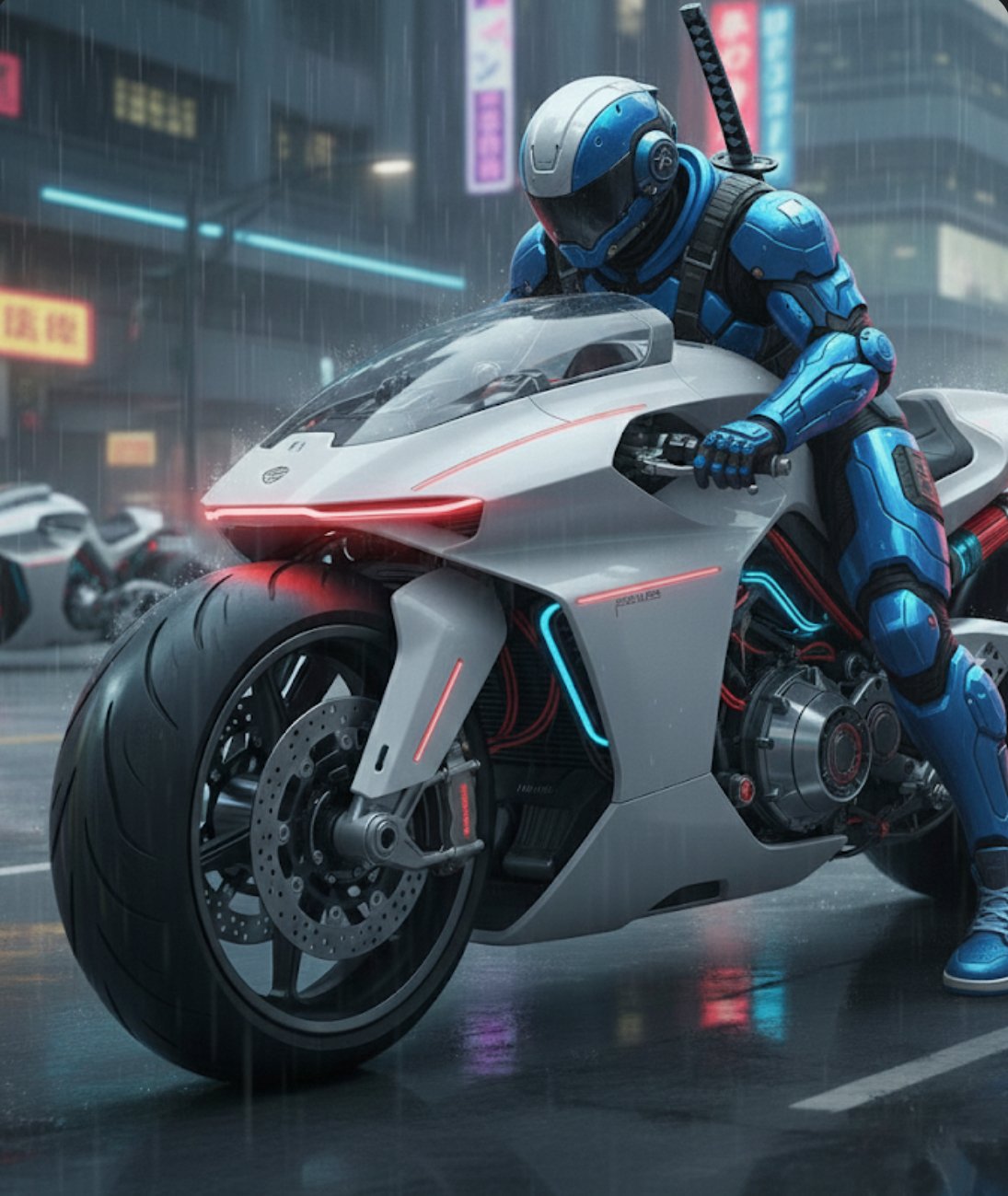 High-end photorealism with glossy materials, precise mechanical detail, and neon-lit rain-soaked streets. Sleek, futuristic, and cinematic.