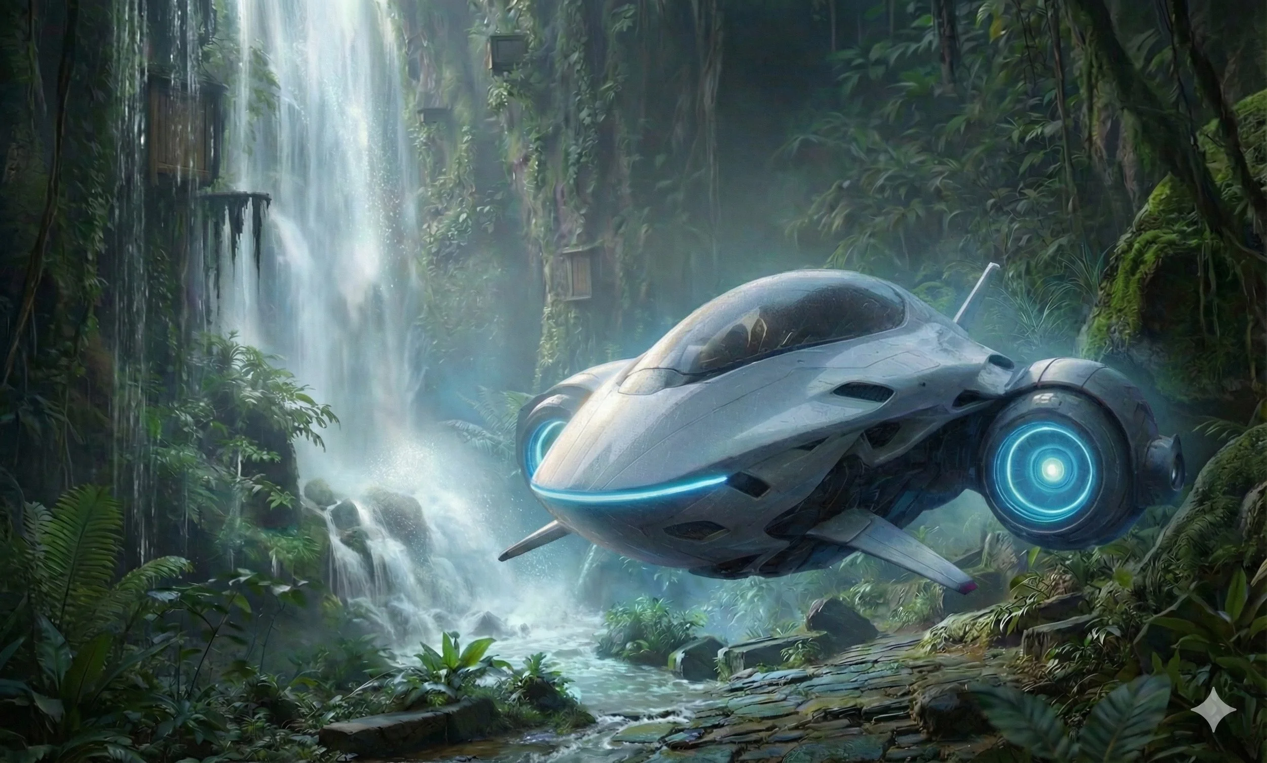 Ultra-detailed natural landscapes blended with sleek futuristic tech. Lush, atmospheric worldbuilding with dramatic lighting and a high-end cinematic feel.